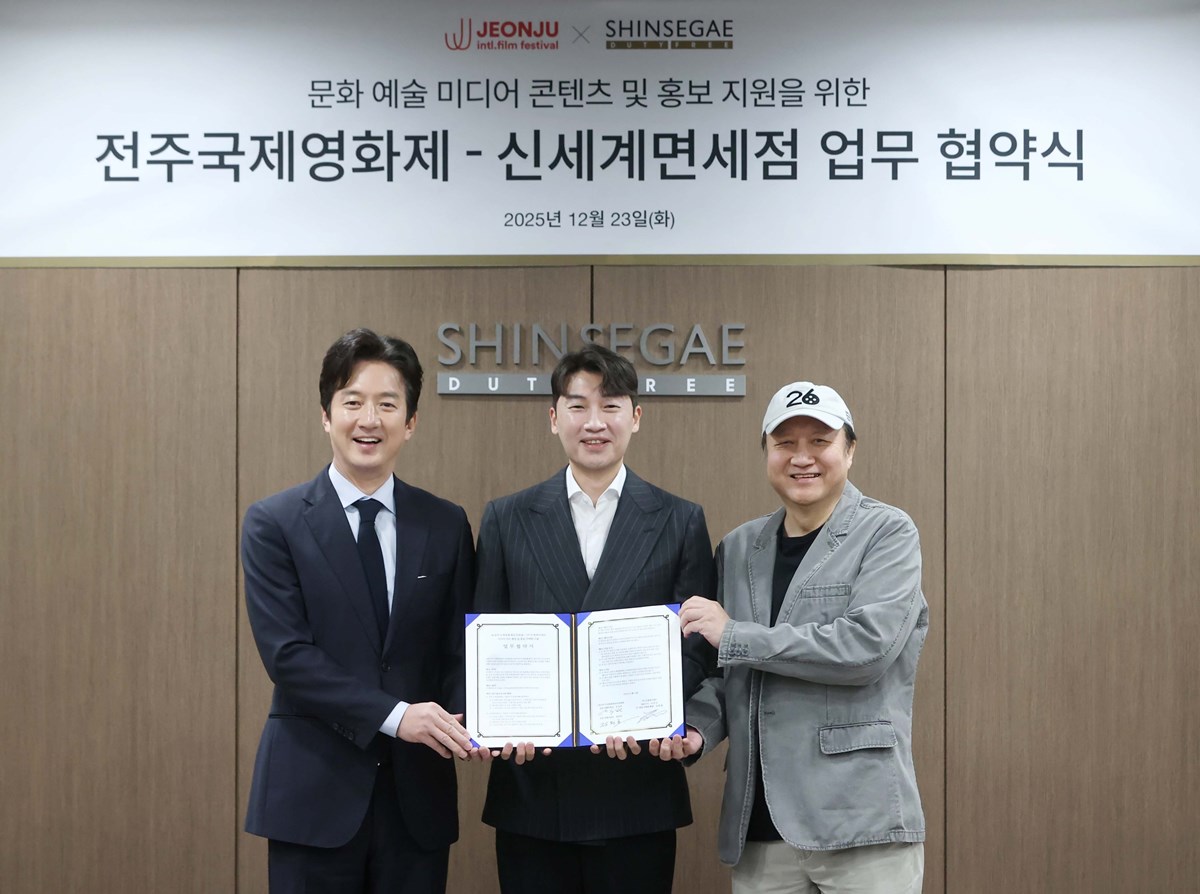 전주국제영화제(공동집행위원장 민성욱·정준호)와 신세계면세점(대표이사 이석구)이 문화예술 콘텐츠 확장과 상호 협력을 위해 12월 23일 신세계면세점 본점에서 업무협약을 체결했다.
