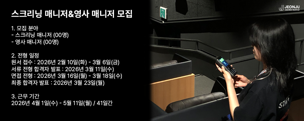 전주국제영화제(공동집행위원장 민성욱·정준호)가 2월 10일(화)부터 3월 6일(금)까지 스크리닝 매니저와 영사 매니저를 모집한다.