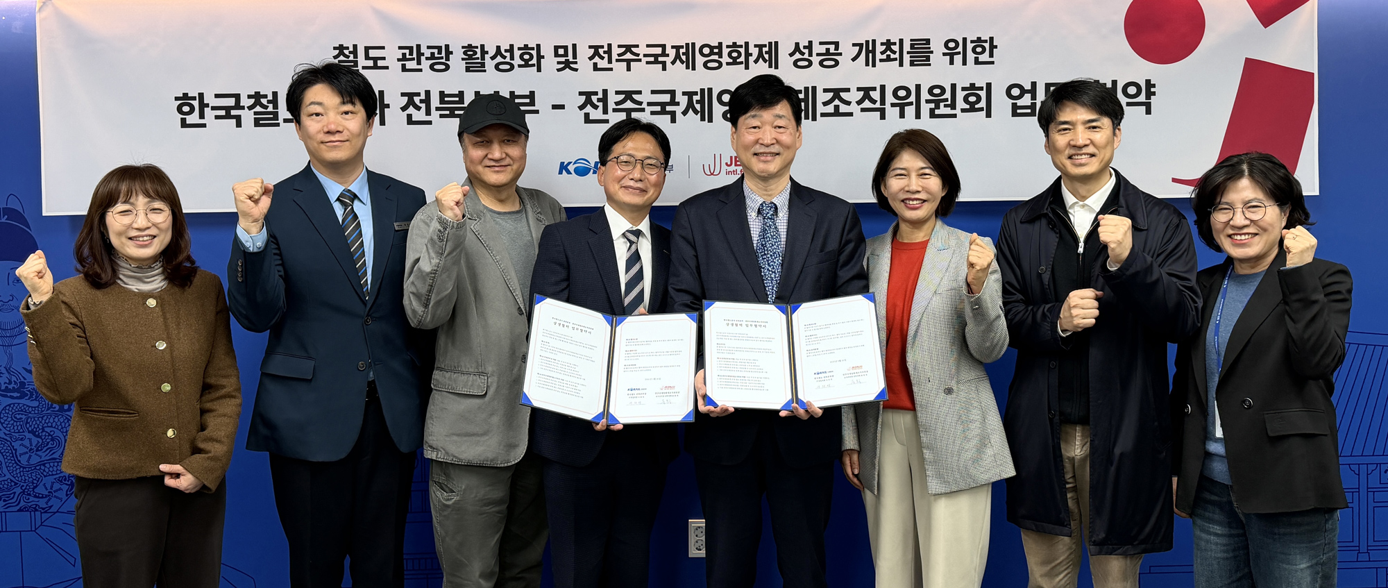 전주국제영화제(공동집행위원장 민성욱·정준호)가 한국철도공사 전북본부와 업무협약을 26일 전주시청에서 체결했다.