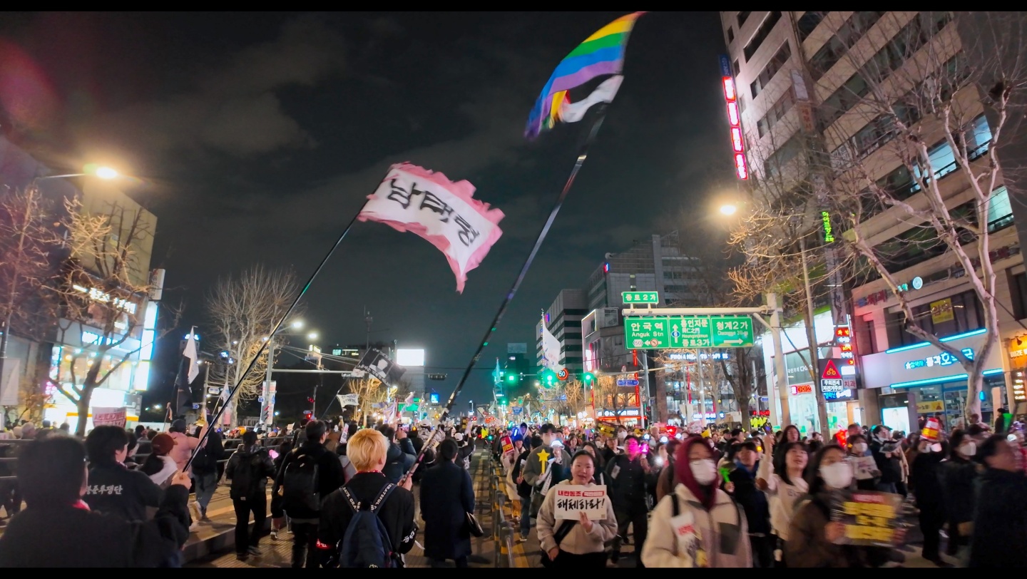 성소수자들이 남태령 투쟁의 중심에 결합했고 이후 '포스트 남태령' 국면에서도 적극적으로 활동 중이라는 대목도 반갑게 다가온다. 아직 차별금지법이 제정되지 않은 상황에서 주류 사회의 노골적인 차별과 혐오 대상인 성소수자들에게 광장은 존재를 당당하게 드러내고 각자 누려야 할 권리를 요구할 수 있는 곳이 됐다. 게다가 이들은 자신처럼 차별과 혐오의 고통을 겪는 이들과의 연대에 적극적으로 나섰다. 이 결과는 지난해 퀴어 퍼레이드에서 만난 전국농민회총연맹의 부스와 전봉준투쟁단의 깃발, 그리고 고공농성 중인 계약직 노동자가 행렬에 뿌리는 화려한 꽃가루로 나타났다.