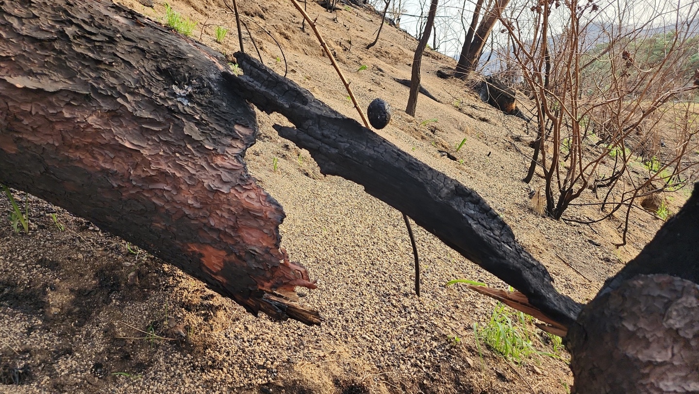 <그을린 돌, 데구르르>는 검게 그을러진 풍경 속에서 부단히 움직이는 작은 돌이 각자의 자리에 남아 있던 친구들과 하나둘씩 마주하게 되는 이야기이다. 하찮고 단순한 존재로 여겨질지 모르는 작은 사물들이 마을에 남은 유일한 증언자가 된다. 그들의 어두운 낯빛과 흠집은 지나간 사건을 온전히 기록하고 있다. 영화는 돌이라는 낮은 위치에서 세계를 구성하며 폐허 이후의 시간을 사유한다. (정여름)