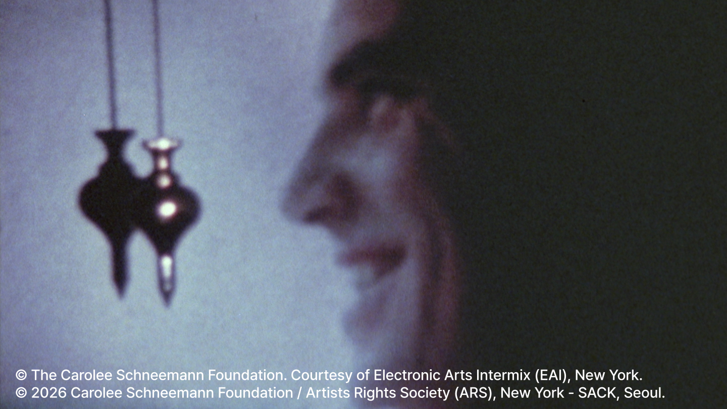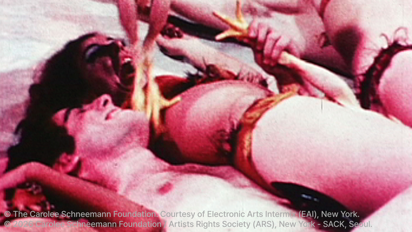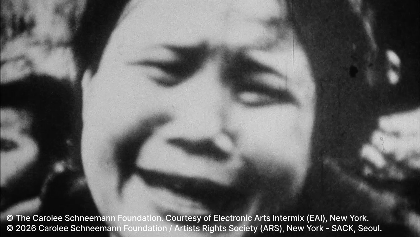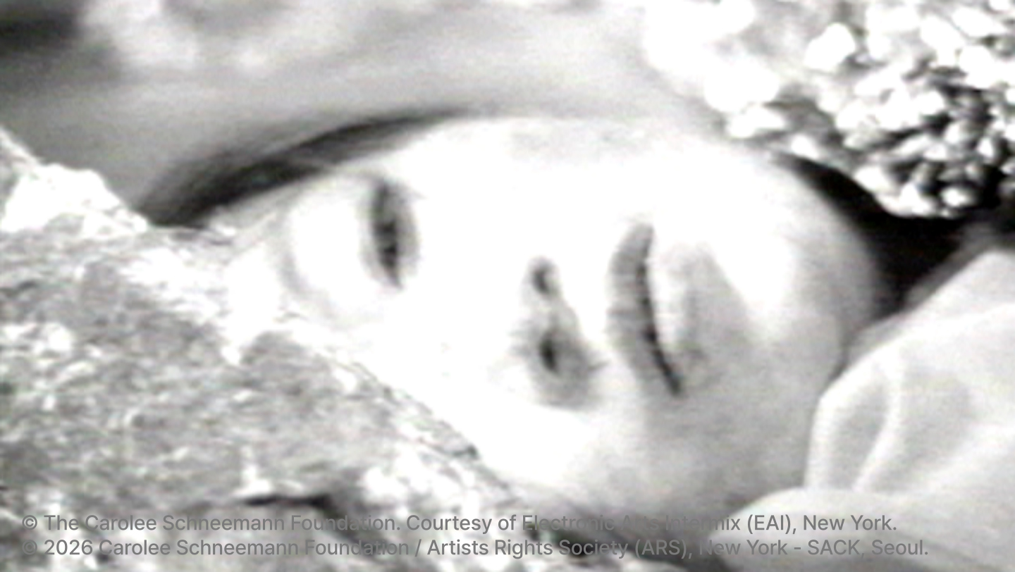 마지막으로 이번 특별전에서 가장 빛나는 에디션이라고 할 수 있는 캐롤리 슈니먼은 60~70년대 언더그라운드 영화와 아방가르드 아트를 대표하는 인물일 뿐만 아니라 미국을 대표하는 비주얼 아티스트다. 그의 예술은 '몸'이라는 화두를 품는다. 슈니먼은 몸을 통해 사적인 몸의 운명과 공적인 몸의 정치에 대해 이야기한다. 이 둘은 다른 것 같지만 궁극적으로는 같은 길을 향한다. 예를 들어 상영작 중 하나인 <플럼 라인>(1971)은 베트남전에 대한 분노와 회한 그리고 연인과의 이별이 중첩되는 슈니먼의 사적/공적 기록이다. 영화는 1977년 텔룰라이드영화제에서 처음으로 공개되었는데, 슈니먼은 작품이 공개된 프로그램의 테마가 여성 감독에 의한 '에로틱한 영화'라고 명명된 것에 분노하며 이에 대한 퍼포먼스로 본인의 성기에서 꺼낸 종이에 적힌 텍스트를 읽었다. 과연 가장 사적인 기록을 이용해 극강의 공적 발언을 만들어 낸 슈니먼식 퍼포먼스가 아닐 수 없었다. 50여 년 전 미국의 예술계를 뒤흔들었던 이 작은 여성의 몸은 아직도 스크린 위에서 저력을 뿜어낸다.