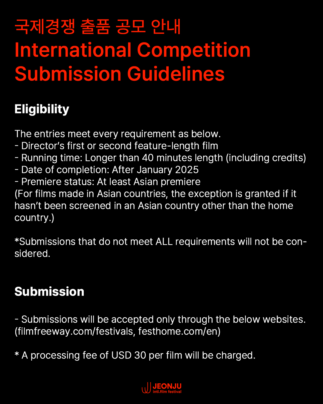 Submissions for the 27th JEONJU IFF International Competition will open on Wednesday, November 26, 2025. This year, we're introducing some changes: submissions can now be made through two platforms, FilmFreeway or Festhome, and a submission fee of USD 30 per film will apply. Please refer to the details below for full eligibility requirements.