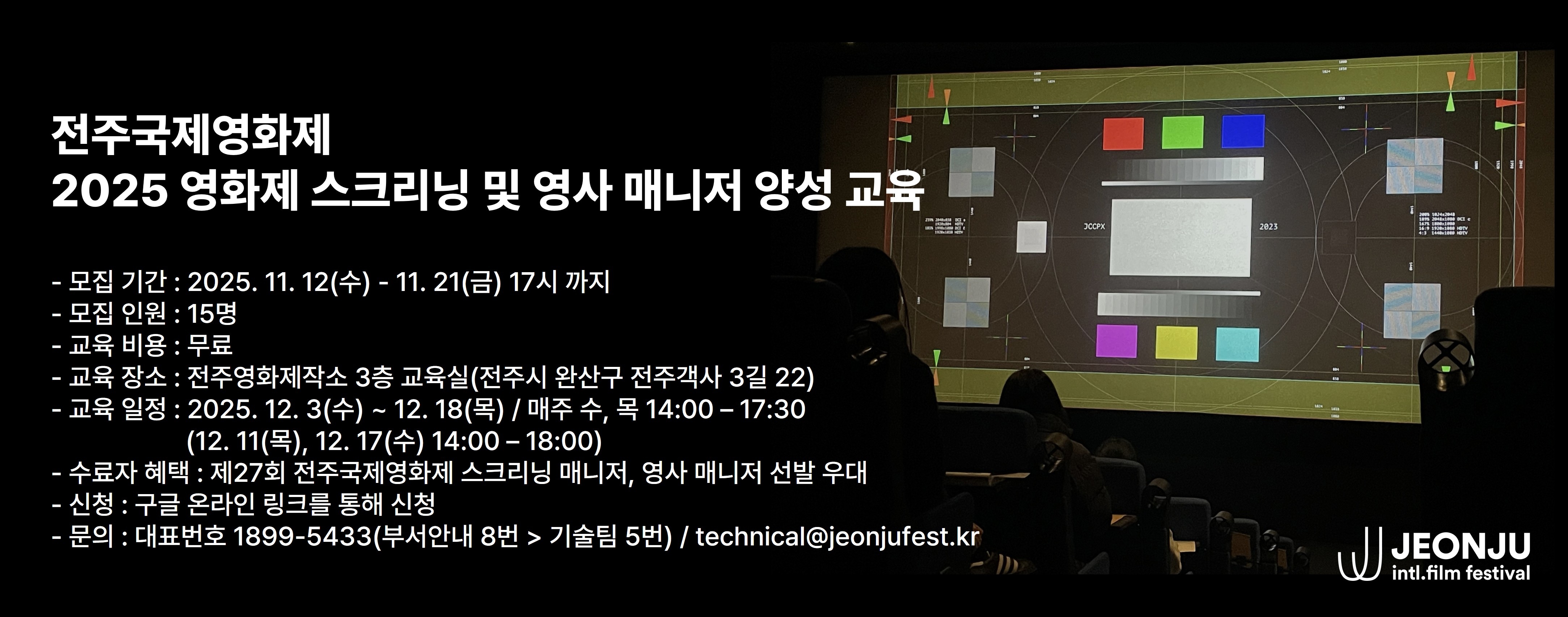 2025 영화제 스크리닝 및 영사 매니저 양성 교육- 모집 기간 : 2025. 11. 12(수) - 11. 21(금) 17시 까지