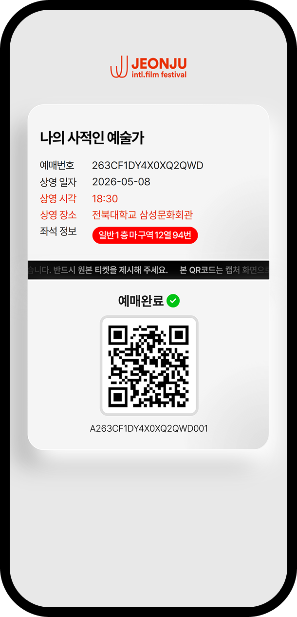 • 전주국제영화제는 대리 구매 및 양도를 지양하며 티켓 위조 또는 정가를 초과한 금액으로 티켓을 거래하는 등의 위법 행위를 엄격히 금지하고 있습니다.